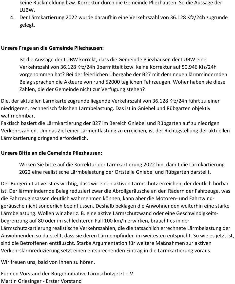 Da wir davon ausgehen, dass die zugrunde liegende Zahl von 36128 KFZ/24h zu einer deutlichen Unterschätzung der, in der Lärmkartierung ausgewiesenen Lärmbelastung führt und wir weiter davon ausgehen, dass die Lärmkartierung Grundlage für die Entscheidungen von politischen Mandatsträgern, wie auch des zuständigen Regierungspräsidiums bezüglich der Planung von Lärmsanierungen ist, bitten wir Sie um die Richtigstellung der fehlerhaften, aktuellen Lärmkarte von 2019 für den Messpunkt Gniebel.