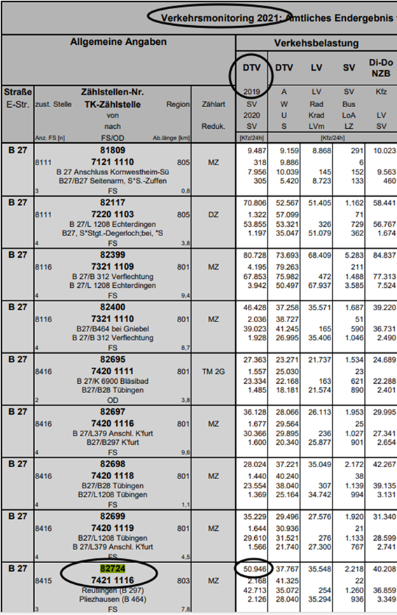 Die Verkehrszahlen der SVZ werden von der MobiData-BW im Internet veröffentlicht. Darin finden sich für das Jahr 2019 an der Zählstelle 82724 (B27 bei Gniebel) die Zahl von 50946 KFZ/24h