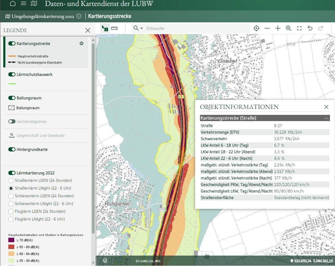 In der aktuellen Lärmkartierung 2022 wird für den Messpunkt Gniebel an der B27 eine Verkehrsmenge (DTV) von 36128 KFZ/24h angegeben:
